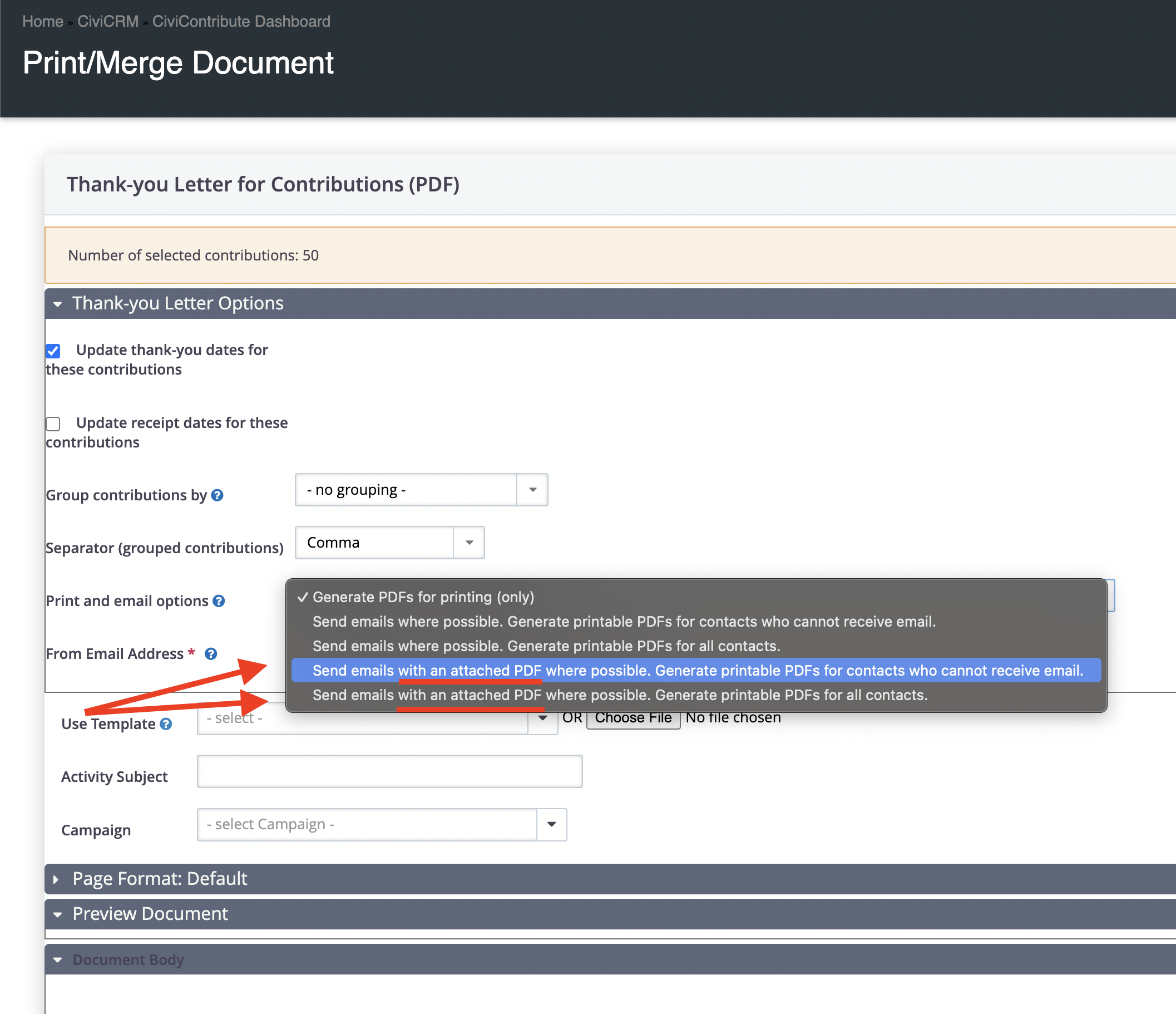 To send an email with a PDF you will have to search your contributions and select the action 'Thank-you letters - print or email'. From there you can configure the PDF that will be in the email.