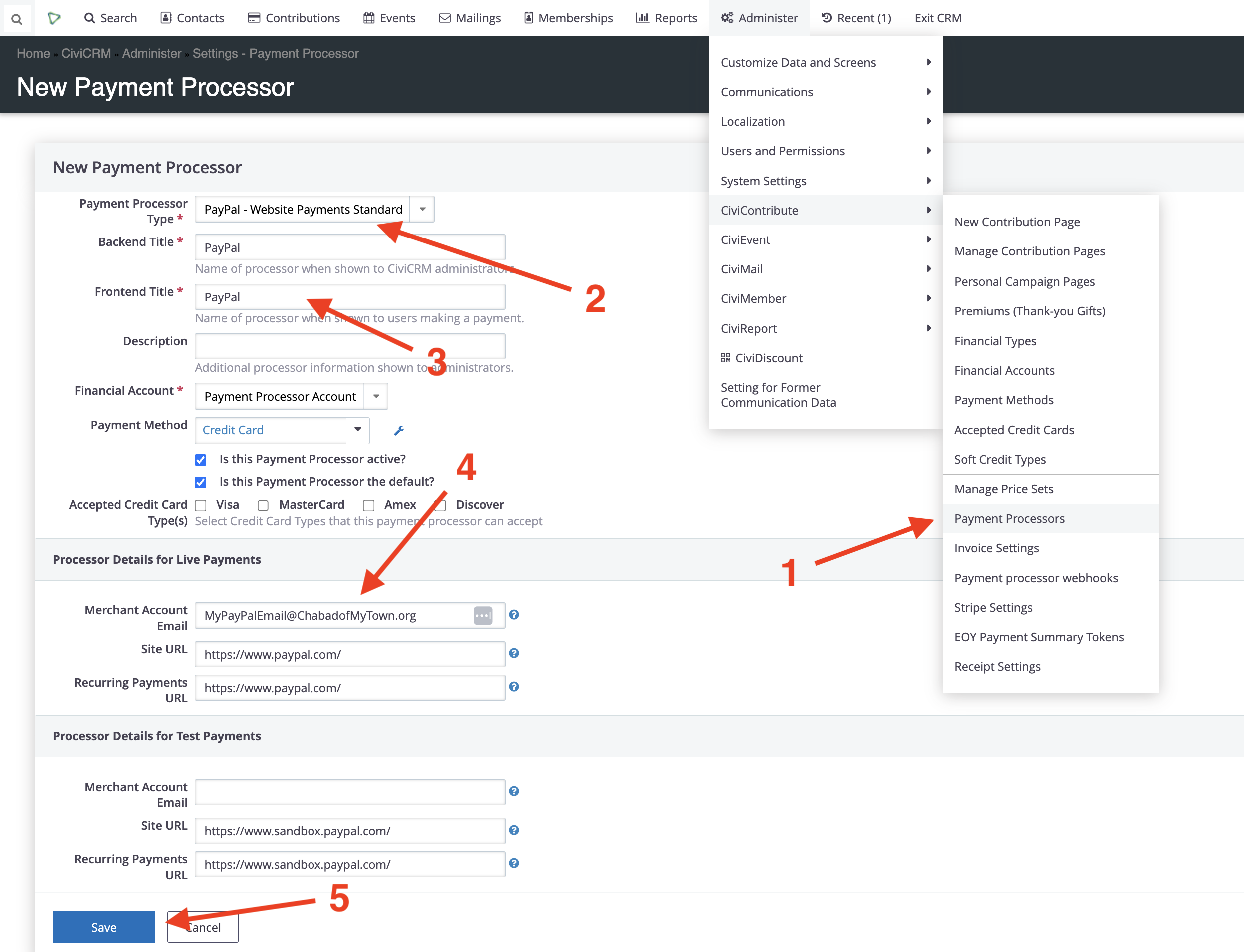 - Go to Administer > System Settings > Payment Processors and click "Add Payment Processor"