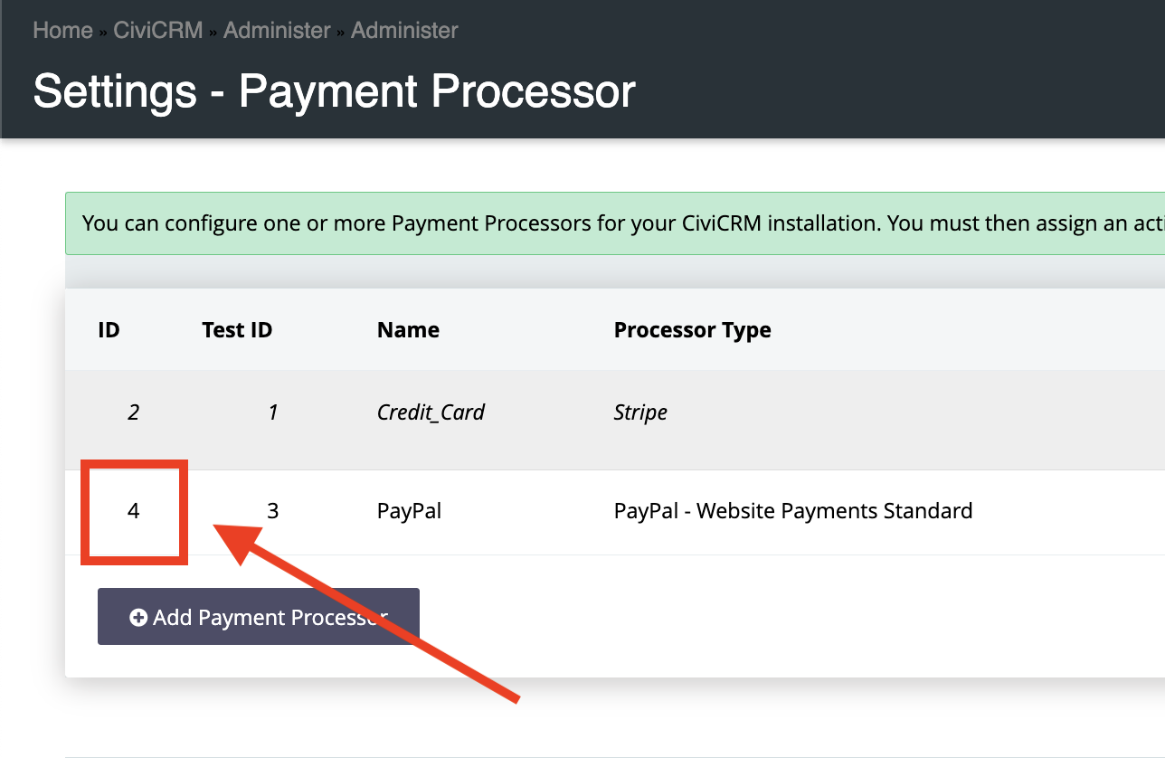 - Take note of the ID# shown at the front of the row next to your payment processor as you will need it later on (Note: make sure you are looking at the LIVE processor ID not the TEST id)